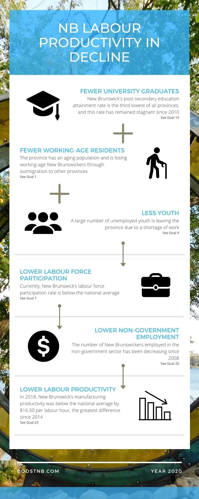 Some of the economic indicators we found that are not progressing include international immigration, interprovincial migration, post-secondary education and training, youth employment, and labour productivity. These goals are particularly relevant for young people, and the infographic below shows how they are all connected: