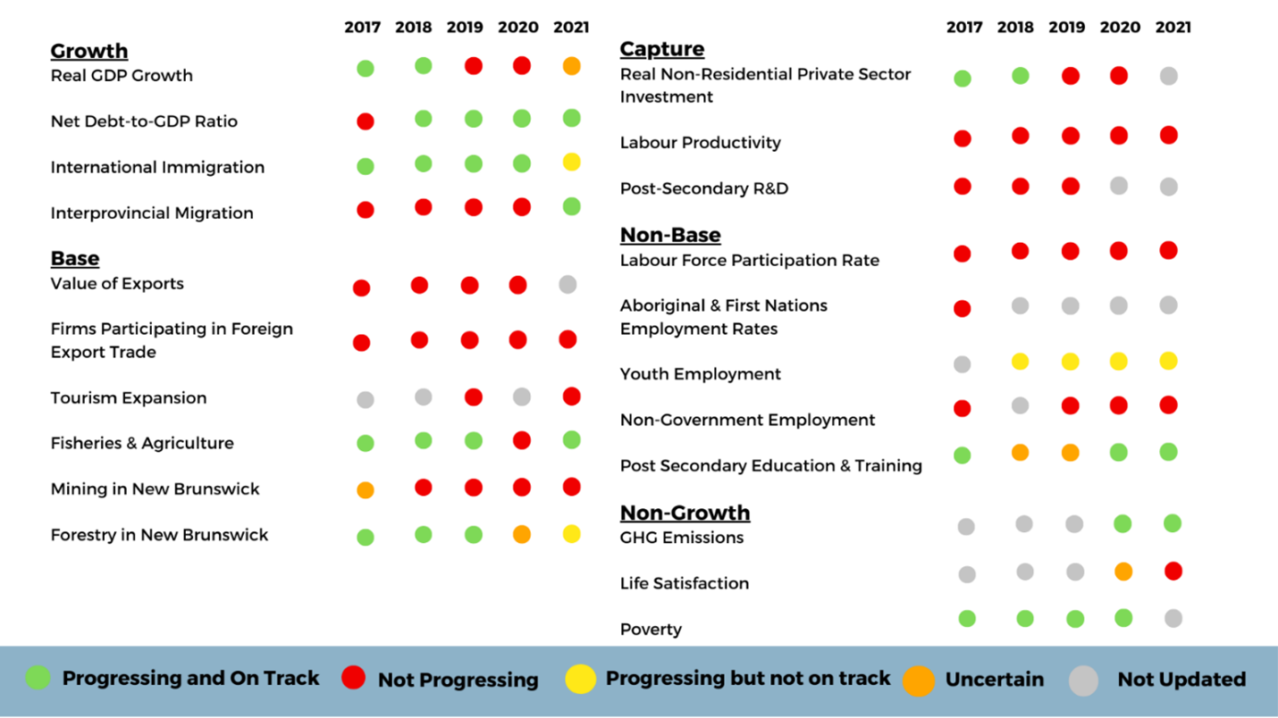New Brunswick is not progressing toward many goals that would ensure economic growth. Many growth-related goals (including the Growth, Base, Capture, and Non-Base groupings) are not progressing, and 9 out of 18 goals do not show progress in the most recent data.